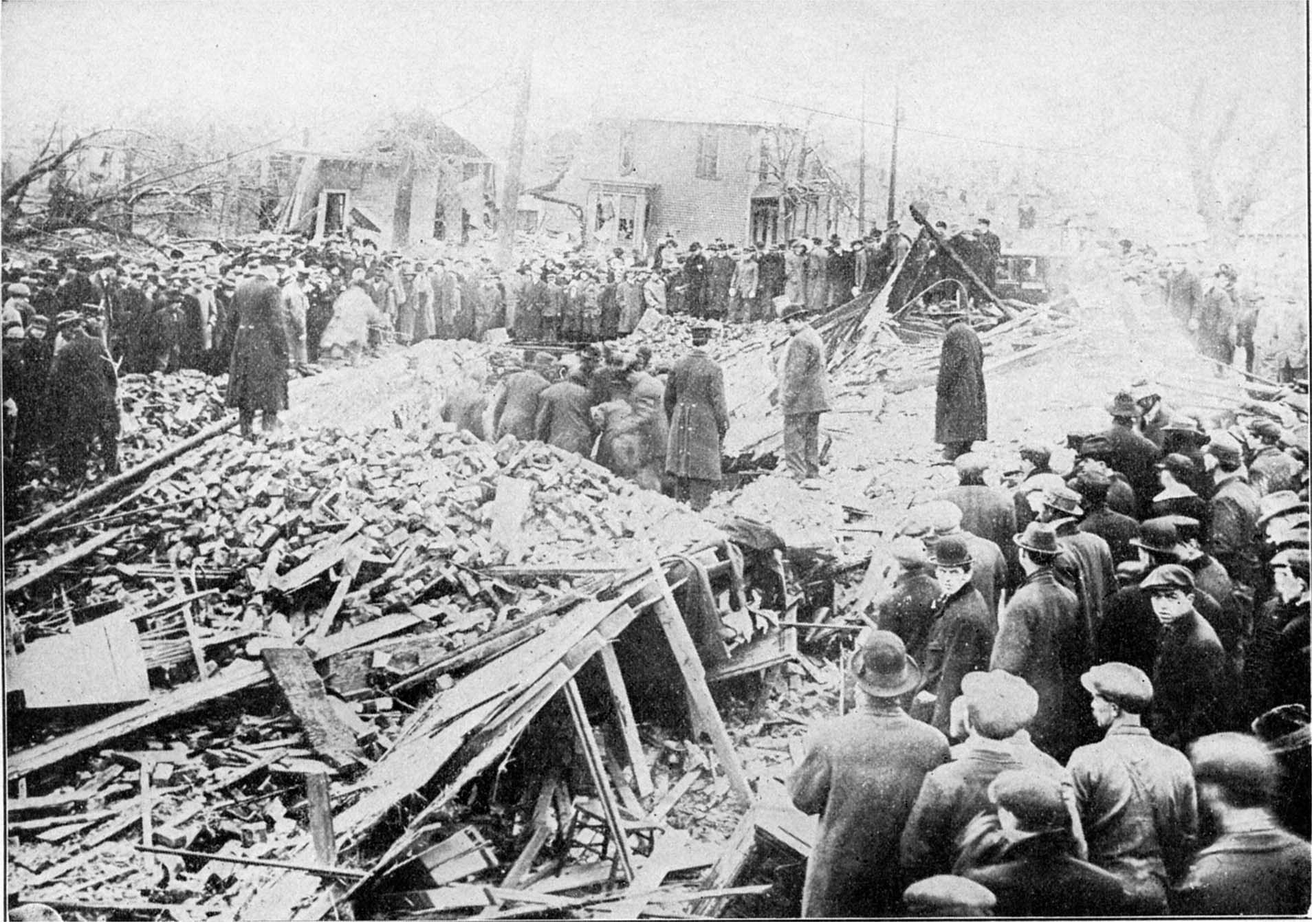 The rising of the sun in the morning revealed a scene of indescribable horror. The work of carrying out the maimed and dead immediately began, but it was a task of big proportions, as many bodies were totally buried under the debris. Hundreds of families were rendered homeless, and the business portion of the community was almost in absolute ruin.