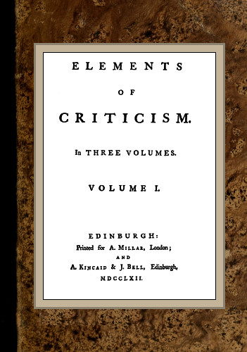 N. B. The Elements of Criticism, meaning the whole, is a title too assuming for this work. A number of these elements or principles are here evolved: but as the author is far from imagining, that he has completed the list, a more humble title is proper, such as may express any undetermined number of parts less than the whole. This he thinks is signified by the title he has chosen, viz. Elements of Criticism.{21}{20}