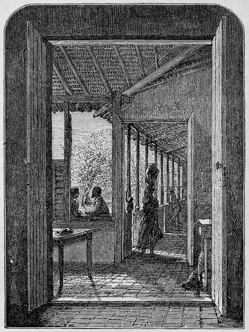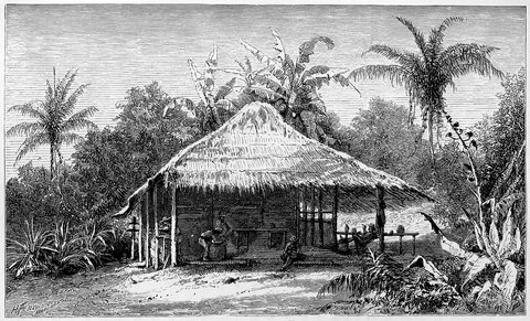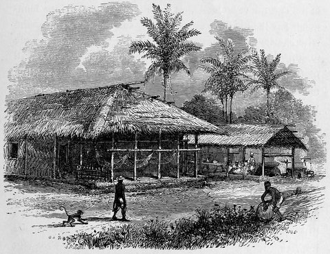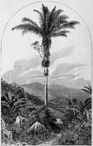 | The palm on the left is a Pupunha (Guilielma speciosa); the large-leaved trees back of the building are Bananas, and the Palm on the right a Javari (Astrocaryum Javari). | |