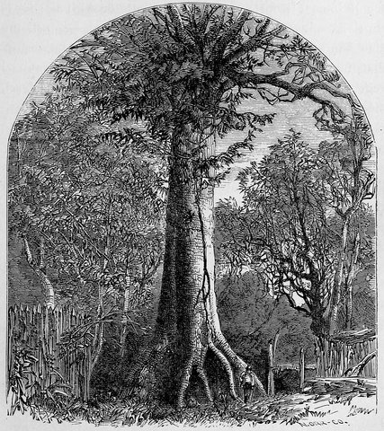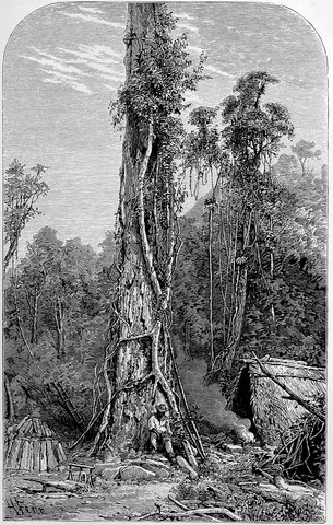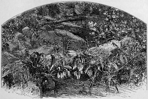 | There are a great many parasites, the stem and roots of which are attached to larger trees; this woodcut represents one of those strange “tree-killers,” as they are called by the natives, belonging to the family of the Fig-trees, which, beginning their growth among the upper branches of trees, gradually descend to the ground, throw out branches around the stem they attack, and in the end kill it in their embrace. On the right are Lianas, from which hang parasitic flowers. | |