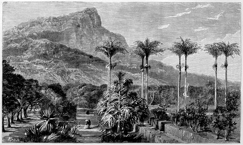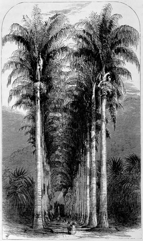 | Part of the Botanical Garden in Rio de Janeiro. In the foreground a Pandanus covered with fruits. The Palms standing in pairs in the great alley are commonly called Palma Real. Their botanical name is Oreodoxa oleracea. The peak of Corcovado forms the background. | |