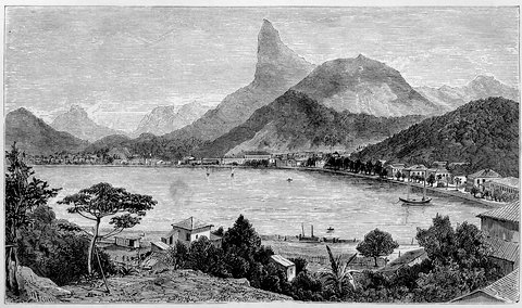 | The great southeastern bay in the harbor of Rio de Janeiro. The highest peak in the centre is the Corcovado, at the foot of which stand the Insane Asylum and the Military School. On the left are the Gavia and the Sugar-Loaf; on the right, Tijuca. A beach runs all round the bay. | |