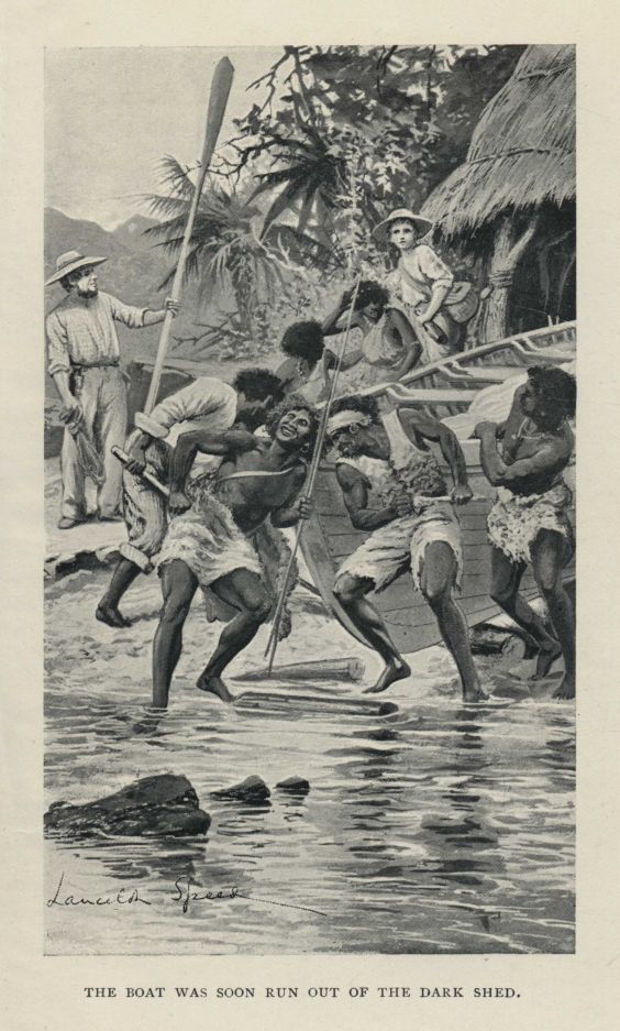 'Never mind that, Foster,' cried the boy; 'look down there on the rocks--there are Combo, and Fly, and some other black fellows spearing fish! They will help us to launch the boat, and come with us too.'
