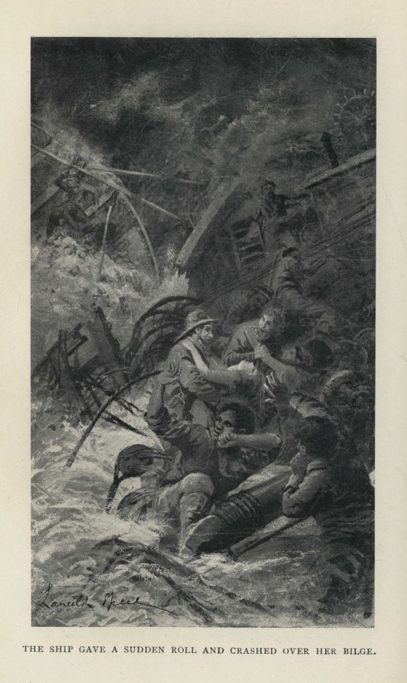 Over the mantel in the dining-room was a marine picture. It was but rudely painted in water-colours--perhaps by some seaman's rough hand,--and the lapse of five and twenty years had dimmed it sadly; but to Tom's mind it was the finest painting in the world, and redolent of wild adventure and romance. It showed as a background the shore of a tropical island, the hills clothed with jungle, and the yellow beach lined with palm trees, while in the foreground the blue rollers of the ocean churned into froth against a long curve of coral reef, on which lay a man-of-war, with the surf leaping high over her decks, and with main and mizzen-masts gone. On the left of the picture was a beautiful white-painted brig, with old-fashioned rolling topsails and with her mainyard aback; and between her and the wreck were a number of boats crowded with men in uniform, escaping from the ship.