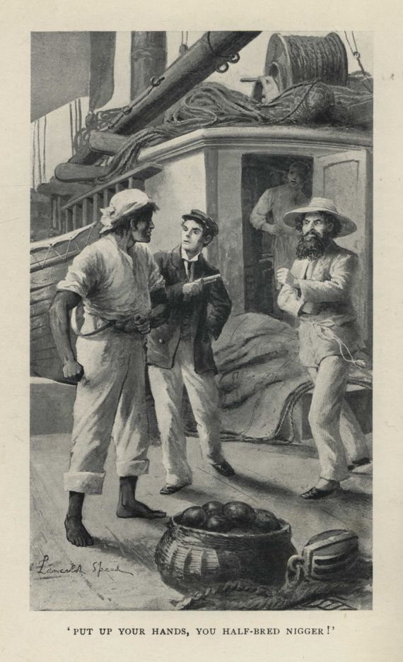 One parting hand-grasp all round, and the shore party go down the gangway into the Customs launch. Mrs. Casalle and Solepa come to the side, and Tom, seizing little Nita in his arms, carries her halfway up the mizzen rigging, so that she may see the very last of Jack and his father and Kate; and then, at a signal from Mr. Brooker, the crew, led by Henry Casalle, come rushing aft and give three parting cheers.
