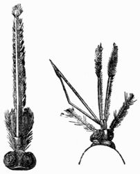 What is the use of the antennæ, resembling as they do, feathers, saws, clubs, &c.? Everything indicates that these organs play a very important part in the life of insects, but their functions are imperfectly understood. Experience has shown that they only play a subordinate part as feelers, and have nothing to do with the senses of taste or smell. There is no other function for them to fulfil, except that of hearing.