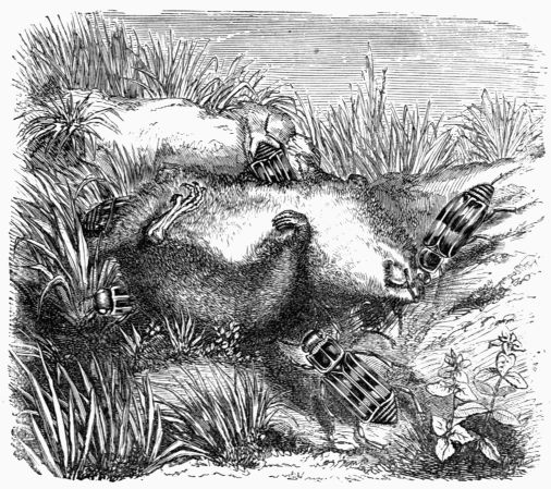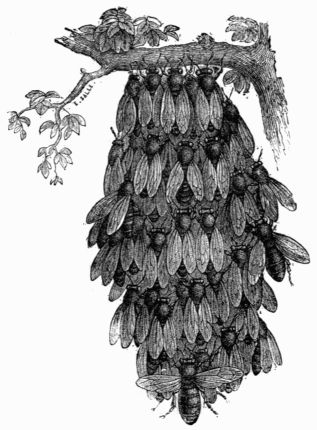 [94] The bee's sting may lead to very serious consequences. It often happens that large animals, such as horses or oxen, tied up in the neighbourhood of a beehive, and which have disturbed the bees, die in consequence of stings received from them.