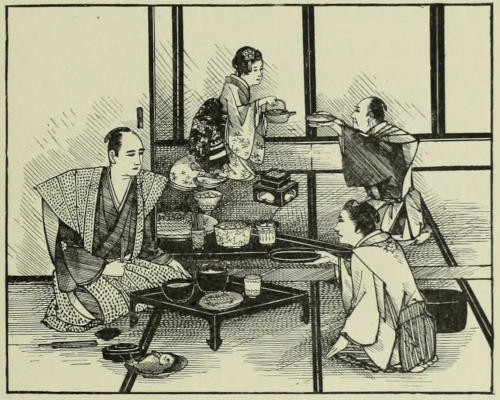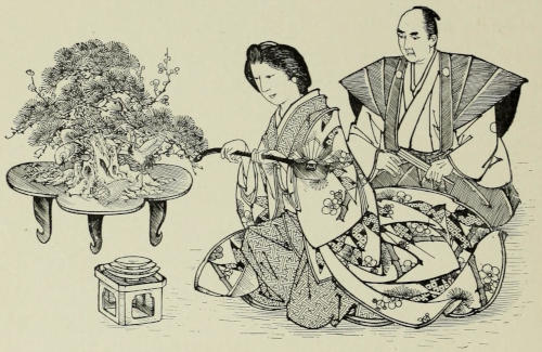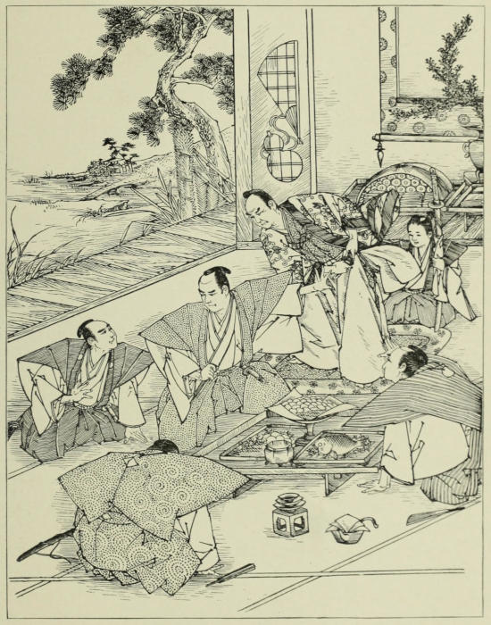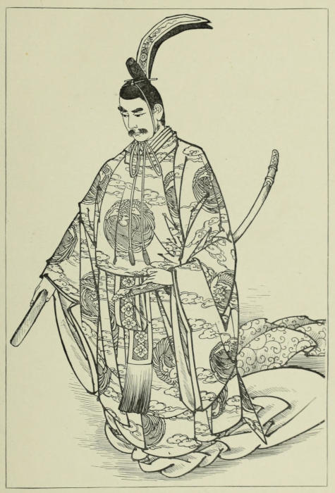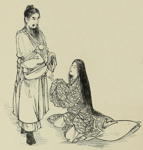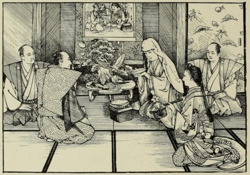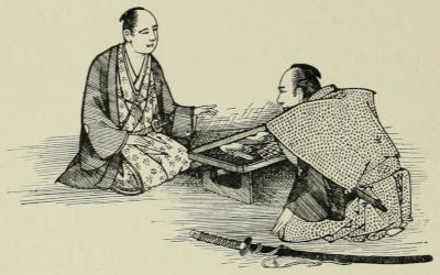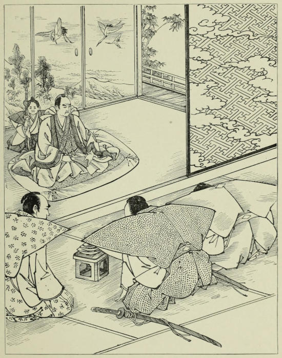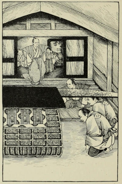 Two days later Sennoske arrived at Kuwana with his party. His reception would have turned the head of any one with less modesty than had fallen to the young warrior’s share. His passion for O Tetsu also acted as an efficient counter-influence in repressing his vanity. He could not but feel gratified at the honors shown to him,—honors such as were seldom accorded to one so young; yet his principal care being always of her and of what she thought of him, every other opinion as to his deeds, however flattering it might be, became by comparison less important and less valuable. The only time when this feeling was in abeyance was during his interview with his father. Sennoske[173] had reached the castle a little past noon, and had immediately been ushered into the presence of the Duke, where he had been detained for several hours, giving a minute account of the events of the campaign. With his father, whose altered appearance filled him with delight, he had been able to exchange only a few words while being conducted to the reception-hall. When he left there he was besieged by persons attached to the court, inquiring after relatives and friends. He was too kind-hearted not to stop, in spite of his impatience, when with a few words he was able either to give assurance of an absent dear one’s safety, or to speak of the bravery and martial spirit of a departed one in such a way that no samurai wife or mother could look upon the loss otherwise than with feelings of pride and satisfaction.