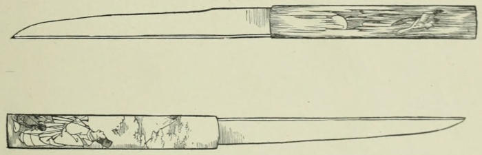 Sennoske and his fair wife enjoyed a lifetime of good fortune. Nothing untoward befell them but such small ills as humanity can never be entirely free from; and these were scarcely felt in their happy lot and in the love which they bore to each other and to the children that time brought them. The young soldier gained additional fame in his command at Idzu; and fulfilling within a year the task that had been intrusted to him, he returned to Ise and succeeded his father in the responsible office of karo. Numa, who had again assumed his old name, retired into inkio,—a private life of quiet and of literary pursuits, which he continued up to his death, which took place fourteen or fifteen years later. Muramasa, with whom he had continued on terms of close friendship and intimacy, died in the same year. The smith’s son continued in his profession; but the blades he forged, although of higher quality than those of other smiths, were not prized as those of his father. They were like them in appearance, in form, and in sharpness, and merely looking at the one by the side of the other, it was often impossible to tell them apart. Even in a few public trials that had been made they proved of equal excellence in all feats that required mere strength; but in fine fancy-work (such as cutting a piece of floating paper,[183] which is one of the crowning tests of the original Muramasa blade) they were a shade inferior,—lacking in a nameless something, which could not be described in words, but which an expert could tell at once when handling them. In short, they were not true Muramasas. A few only of these competitive trials were made, however, and in Kuwana at least they were soon prohibited; for they always ended in heated discussions and bloodshed between the contending parties. As a singular testimony to the value of the older weapon, it was noticed that its possessor nearly always came off victorious.