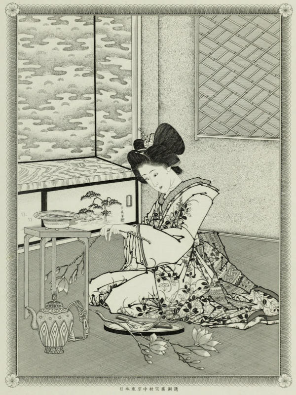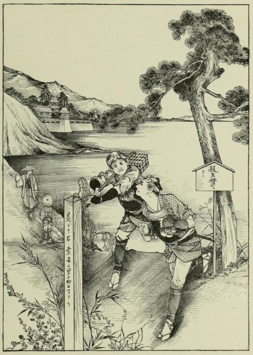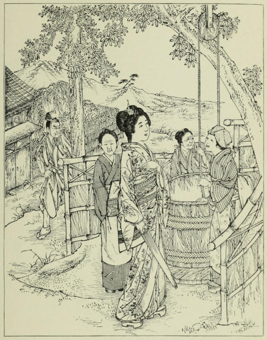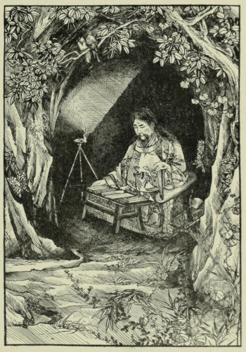 The five engravings on copper have been executed by a young Japanese, Mr. Nakamura Munehiro, of Tokio, one of the best engravers in Japan, who also made the original drawings for the same. The other pictures were drawn by Shirayama Dani, a young porcelain painter in the employ of Fujiyama,[xii] of this city. It shows the versatility of Japanese artists, that although the young man had never in his life done anything but porcelain painting, which is done in pure wash, he succeeded without instruction, in a very few days, in making pictures for reproduction. In spite of their sharp outline they are done not with pen and ink, but with a Japanese brush.