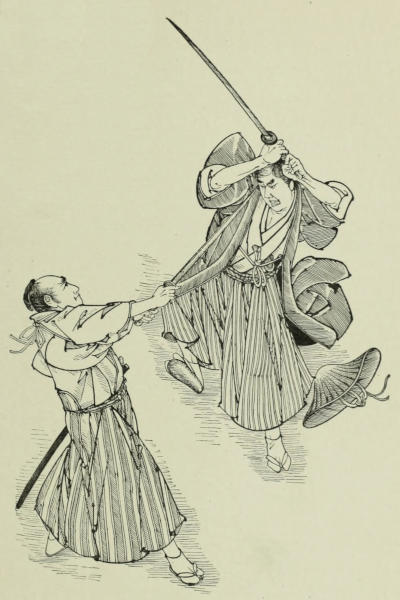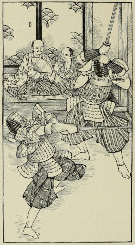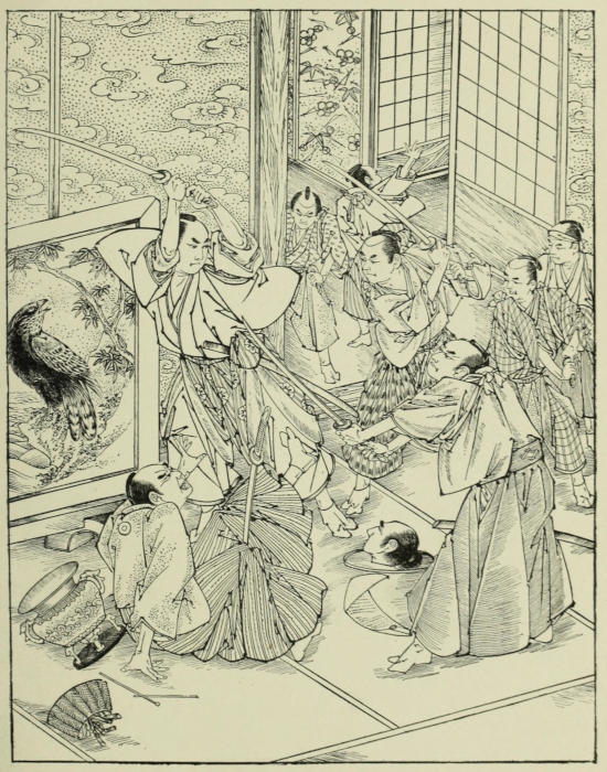 Great, however, as was the influence of such thoughts and feelings, they could not altogether paralyze samurai instincts, and in response to Sennoske’s challenge three blades were drawn[158] almost immediately. With a motion so light that it implied no effort, the young soldier’s weapon whizzed through the air, causing the head of one of his antagonists to roll on the floor, and in its downward sweep striking a second one under the shoulder, cutting the arm clean off. It was the work of a few seconds merely; but by this time two more of the party, among whom was Taka Suke, had unsheathed their swords.