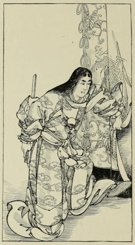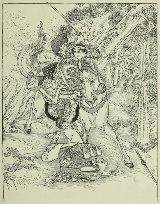 As Sennoske looked at the man writhing at his feet, he thought of his dead mother, of his father’s manhood blighted and seared by foul machinations, and of his faithful attendant’s untimely death; and a savage feeling of revengeful joy, utterly foreign to his brave but gentle nature, took possession of him. He lowered his blade, which he had raised already, and addressing the other, spoke to him in words which fell upon his ears like molten lead injected into living veins. As he called him by name,—by the hated name of Taka Suke, than which none was more execrated in the country,—the spectators gave unmistakable signs of satisfaction. “It is small honor, and little cause for deserving men’s esteem, to fulfil the obligations of kataki-uchi against you, Taka Suke,” he said, “and it merely becomes a duty like that of the executioner putting a criminal to death. You have tyrannized over and trampled upon all in your power, you have, without compunction, bereft them of possessions, of good name, and of life, as long as the Hōjō influence gave you authority and means, and left your victims without redress. Now, when this power no longer shields you, you have been unable, in spite of the assistance of six stalwart men-at-arms, to defend yourself[162] against a ‘boy,’ as you call him. But this ‘boy’ is strengthened and inspired by something which you lack, and which you think of no value. He fights in the holy cause of right and of a just retribution. In killing you I restore to my father his honor and prestige, which you tried to take from him; and in his name, and in the name of all others whom you have unjustly accused and condemned, I hereby fulfil—”