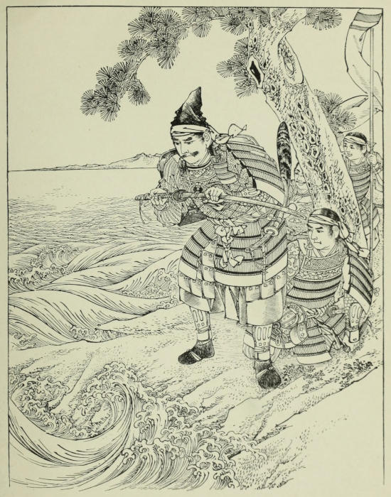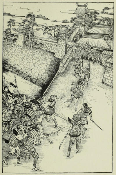 He delivered his letters, and the joyful tidings at once spread through the castle and into the town. The Duke, learning that the courier had himself participated in the fight, ordered refreshments brought in, of which he caused him to partake while the[171] despatches were being read. When the reading had been concluded, the rich wine and generous fare, and still more perhaps the absorbing attention which was paid to the recital, invigorated the new-comer, who forthwith gave a graphic account of the battle. From general outlines he soon passed on to particulars, which he knew would be welcome, speaking of the way the Ise men had distinguished themselves, and giving the names of those who had won special renown. None, however, stood as high as Sennoske, who had saved the life of Nitta, the commander-in-chief, during the hottest part of the fray, who seemed invulnerable, and whose exploits had made him and his sword an object of superstitious terror to the enemy. The courier went on to speak of the command which had been intrusted to the young hero, and of the fact that he was now on his way home, having been detained only temporarily by a difficulty with Nagasaki[172] no Taka Suke, the noted Hōjō partisan, whom, together with six of his retainers, he had attacked and killed single-handed.