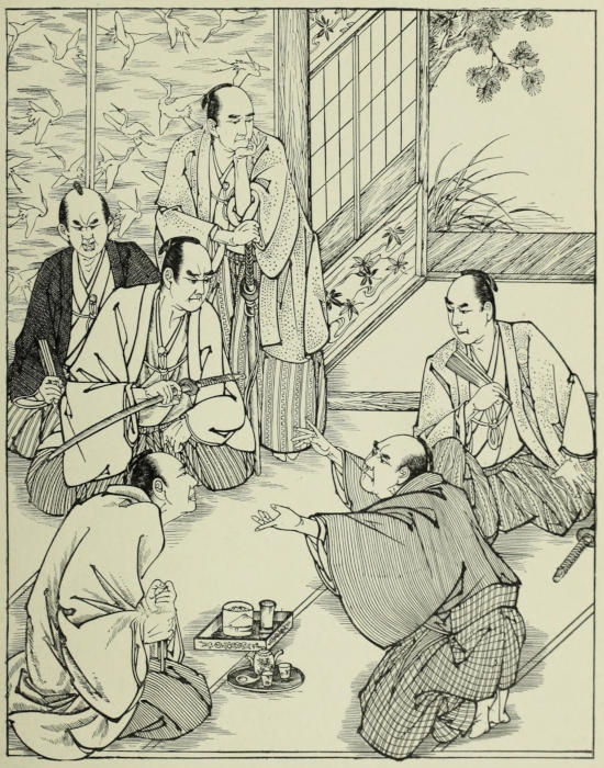 “‘Yes,’ Taka Suke, now dropping his mask, replied angrily, ‘I know you are one of those who believe in chiugi and kataki-uchi and all those devices which are implicitly followed by fools and weak-minded persons, but which men of sense make use of only to suit the occasion. I can understand the beauty of kataki-uchi when used against those who have injured me, and of chiugi when it governs the behavior of my dependants. It is true our cause is threatened, and it is necessary for the continuance of Hōjō power that men of influence, wherever they may be found, should be enlisted in its support. Such men as you, respected[145] by samurai and by the rabble, equally ready with sword, tongue, and pen, are rare enough, and their action influences thousands of others. I do not yet despair of bringing you over to our side. Men of your stamp are inclined to sacrifice themselves, satisfied with the delusion that their virtues will be lauded and appreciated after their death. But I will leave you no such consolation. I will have it spread about that through you your master was betrayed. I will have you brought to the castle of Kamakura; and while it will be said that you have left your family in order to enjoy a licentious life with the wages of your treason, you shall pine away a close prisoner. What do you say to this prospect; and how, under these circumstances, will your name be spoken of by posterity?’