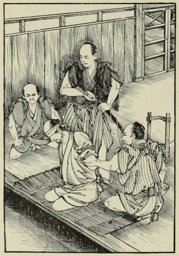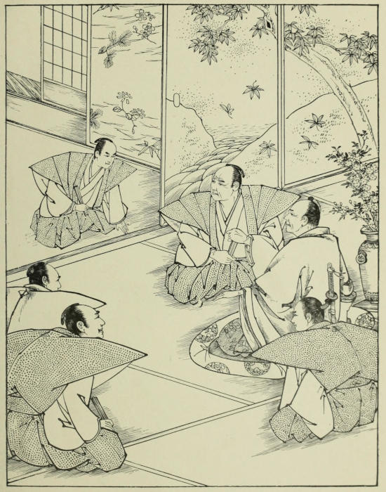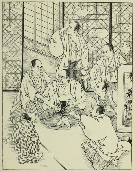 The servant who had brought him hither, and who under pretence, probably, of waiting for orders had listened to the whole conversation, conducted him back to his own room. On entering[131] it he found there a number of superior Ise officers, who, hurrying back like himself, had just arrived, and to whom Yamagawa had told the affair of the sword. One look at his master satisfied the old servitor that the former’s mission had been unsuccessful; but he could learn no particulars, for to all inquiries Sennoske, who wished to spare him the shock of the communication, at least for the present, gave only evasive replies. Happening to look at the servant of the house, still standing by the half-open door, with eyes and ears intent upon what was going on, Yamagawa immediately divined that the fellow had listened at the other room; and pulling him in by the sleeve, he ordered him, with short word of command, to tell all he had heard there. To do this was of course a serious breach of etiquette; it was, however, with no thought of taking umbrage at the freedom assumed by his old servitor, but only to spare him the shock of what was coming, that Sennoske interfered. Nevertheless, his assumed displeasure remained unheeded, and even unnoticed. Giving the young fellow a good shaking, Yamagawa again ordered him to repeat what had taken place in the other room; and trembling and stammering, the other, in spite of his fright, gave a sufficiently lucid account of what he had witnessed.