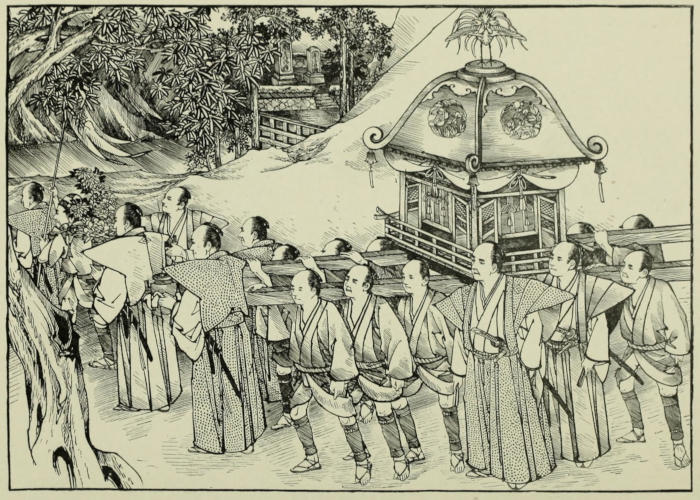 “Your father succeeded apparently in forcing notice upon himself; for the same day, as evening came on, a posse of soldiers entered his house. His swords and weapons were taken from him, and his arms pinioned; but this was not done in the coarse, brutal way in which prisoners generally are treated, the leader of the soldiers showing all possible consideration, and even apologizing for what he did. A large and convenient nori mono (palanquin) had been brought to the door, and in this[140] Mutto was carried more like a chief followed by his retainers than a disgraced rebel prisoner. His captors took him directly to the castle, into the presence of Taka Suke, when all retired, leaving the two men alone.