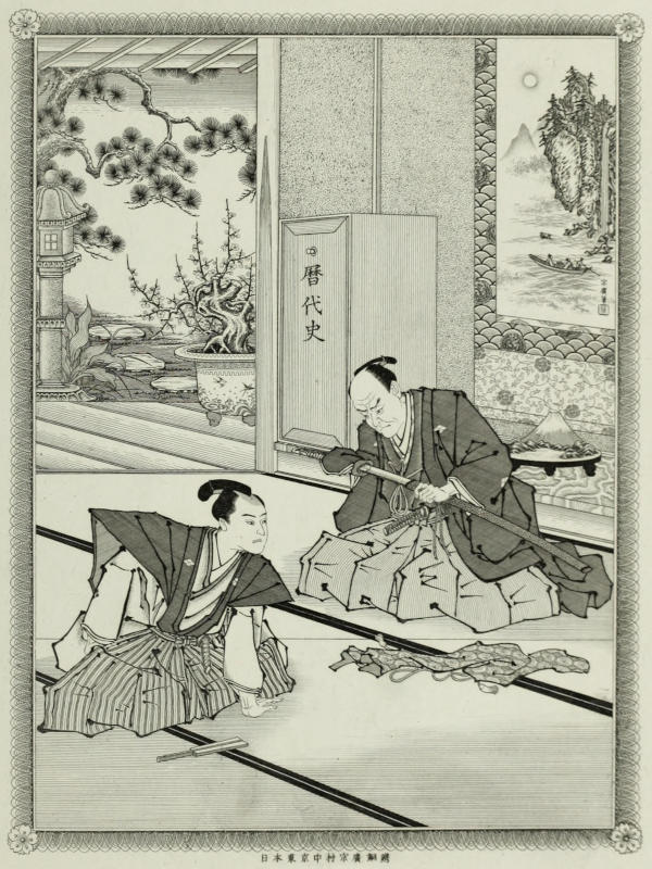 “Outwardly calm and composed, although this speech did not fail to stir him to the deepest anger and indignation, Mutto replied: ‘Whatever you may do, the truth will sooner or later be certain to prevail. Knowing that it is impossible to appease[146] the manes of my murdered lord with your blood, I can only show my devotion by committing seppuku, which I will not now defer any longer. No honest man’s finger shall point at me in scorn, no disloyal samurai shall cite me and claim me as a living companion in shame. I will have the satisfaction of having lived and died as a feudal retainer should live and die,—loyal to my lord and master.’