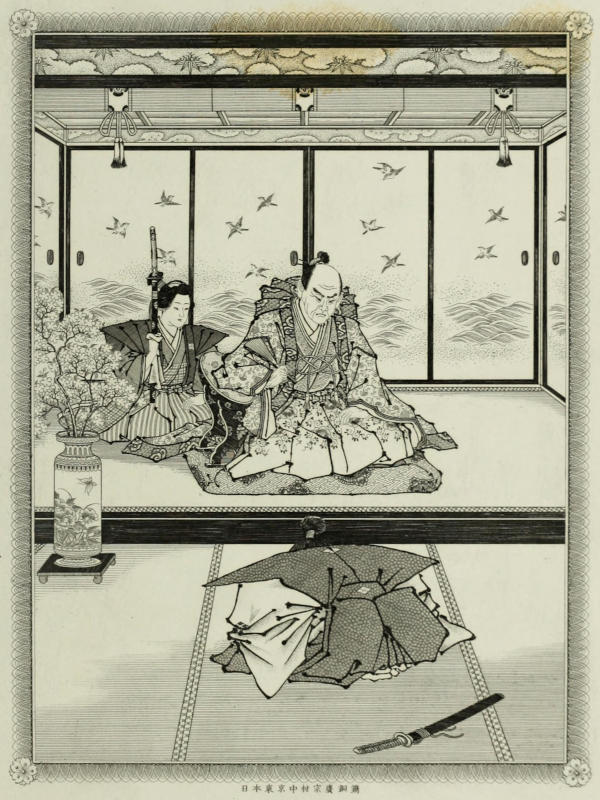 The kakioki here came to an end, concluding with the usual formulas, stamp, and seal pertaining to such a document. During the reading, Yamagawa had retained his death-grip on his wound. Superior will-power made him oblivious to physical pain, and enabled him to retain consciousness until the testament had been read to the end. Motioning now to Sennoske to come nearer, and summoning all his energies, he succeeded, although in a scarcely audible whisper, in saying his final words:—