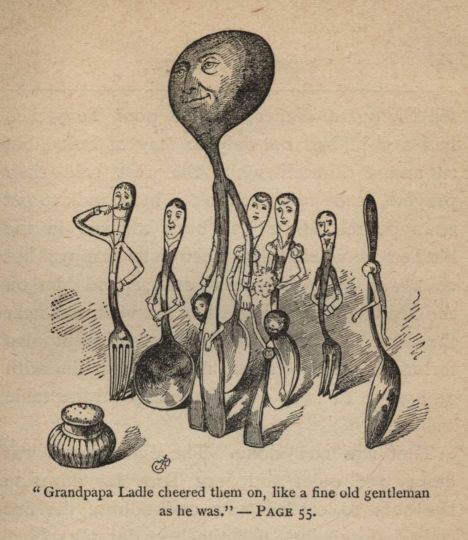 Plays in the barn were a favorite amusement, and we dramatized the fairy tales in great style. Our giant came tumbling off a loft when Jack cut down the squash-vine running up a ladder to represent the immortal bean. Cinderella rolled away in a vast pumpkin; and a long black pudding was lowered by invisible hands to fasten itself on the nose of the woman who wasted her three wishes.