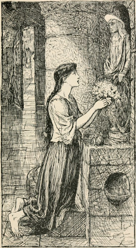 In those days, at feasts, it was the custom for one after another to be asked for a song, and the harp was passed round the table, each taking it in turn and accompanying himself whilst he sang. Cædmon thought that he could not sing, and when he saw that his turn was coming near, he used to get up and quietly leave the table and go home. One day he had left the feast in this way and gone to the stable where it was his duty that night to take care of the horses. Having done his work he settled himself to sleep, and in the night one stood by his side, and calling to him, said, “Cædmon, sing some song to me.” He answered, “I cannot sing, for that reason I left the feast and withdrew to this place, because I cannot sing.” But he who stood by his side answered, “However, you shall sing.” “What shall I sing?” asked Cædmon; and the answer came, “Sing the beginning of created beings.” Then in his dream he sang in praise of God the Creator with words which he had never heard before. When he awoke, he remembered what he had sung, and added more verses to those which had come to him in his dream. He told the steward who was set over him of this gift of song that had been granted to him in his sleep, and the steward took him to the Abbess Hilda. She bade him in the presence of herself and of several learned men repeat the verses which he had made, and they all decided that it must be through the grace of God that this gift had come to him. They explained to him a passage from the Bible and bade him go away and turn it into verse. Next morning he came back and recited to them the excellent verses which he had made. Then Hilda bade him give up his work on the farm and come into the convent and become a monk, that he might devote himself to cultivating the gift of song which he had received. She directed some of the brethren to teach him the sacred history contained in the Bible, that he might turn it into song. After they had taught him, Cædmon would think over all that he had heard, turning it over in his mind as the cow chews the cud, till he brought it out again as harmonious verse, which he would sweetly repeat to his masters, who now in their turn became his hearers. He sang of the Creation and of the doings of the people of Israel and of the life and sufferings of the Lord Jesus Christ, and tried by his poems to lead men to love virtue and hate vice. Through his sweet singing great fame came to Hilda’s convent, and after some years he died there in great peace and holiness.