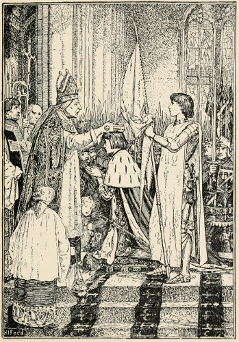 Amongst our forefathers, the wild German tribes who conquered Britain and made it England, women had always held an honourable place. This made it possible for them, in the days when the Christian faith was first preached in England, to do a great deal to help the work of the Church. They did not have to spend their days in fighting like the men, and they were eager to listen to the new teaching which showed them many different ways of serving God and helping their fellow-creatures. Probably it was the Christian wife of Ethelbert, King of Kent, a French princess, who helped to make him willing to listen to Augustine, the missionary sent from Rome by the Pope to convert the English. Kent was the first of the English kingdoms to become Christian. In the northern part of England there was a great king called Edwin, who ruled over Northumbria and had his capital at York. He seems to have heard much in praise of one of Ethelbert’s daughters, Ethelburga, who was so beloved in her family that they called her Tata, the darling. Edwin sent messengers to ask Ethelburga’s brother, Eadbald, who had succeeded his father as king, to give him his sister in marriage. But Eadbald said that he could not give his sister to a heathen. Edwin would not be refused. He sent messengers again, and said that if only he might have Ethelburga as his wife, he would allow her to worship in her own way, and would be willing to adopt her faith if, on hearing more about it, his wise men should decide that it was better than his own. So Ethelburga was sent to York with Bishop Paulinus as her chaplain. Edwin was true to his word; he treated Paulinus kindly, and after a while listened to his teaching, and when he had consulted his wise men, and they too were willing, he decided to be baptized.