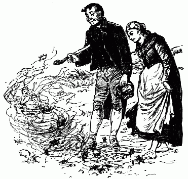 The discovery always made a great sensation; people came from the surrounding villages to wonder at the lean, gaping, knowing-eyed small stranger in the crib, and to propose all sorts of charms which should rid the house of his presence, and restore the rightful heir again. They were not especially polite to the poor changeling. In Denmark, and in Ireland as well, they dandled him on a hot shovel! If he were really a changeling, the fairies, rather than see him singed, were[136] sure to appear in a violent fluster and whisk him away, and at the same minute to drop its former owner plump into the cradle. And if it were not a changeling, how did those queer by-gone mammas know when to stop the broiling and baking?