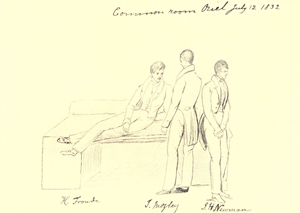 Given, therefore, Miss Giberne’s ardour in the matter, and her frequently-recurring opportunities as a visitor, it would seem almost certain that she would not have let slip any chance of portraying so noticeable a luminary as Hurrell Froude, often absent, like herself, from Oxford, during 1831-1833, and away from it almost altogether afterwards. Her discovered sketch-books, preserved in the hands of relatives and friends, yield, so far, but a single page in which Froude appears. xviii She groups and labels him with other conspirators’ at a historic moment,[5] in the one Oxford Common Room which ‘stank of logic.’ Something in the too quiescent gesture of the graceful person ‘on the box,’ as well as in the nature of the circumstance, make one suspect that the whole was drawn not on the spot, nor from memory, but from hearsay at the time. Were such the case, the implication would be that Miss Giberne had a good prior knowledge of Froude’s face and figure, and even that she was not committing these to paper for the first time. This little drawing is the property of her nephew, George Pearson, Esq., of Manchester; it is owing to his courtesy and kindness that it is here made public.