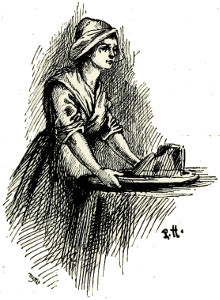 Meanwhile little Peter had sat down on his stool by the fire. For a little while he sat very still, for he was thinking over the visit of his friend John Paqualin. He felt rather unhappy about him, he could not quite have said why. But when we are children it is not easy to think of any one person or one thing for long together. There are such lots of things to think about, that one chases another out of our heads very quickly. And so Peter soon gave up puzzling himself about the charcoal-burner, and began counting the sparks as they flew out of the blazing, crackling, pine logs up the wide chimney.[Pg 15] Unfortunately, however, he was not a great arithmetician; and though he began over and over again at plain one, two, three, he always got wrong among the fifteens and sixteens; and never succeeded in counting up to twenty at all. Nothing is more tedious than making frequent mistakes. So he got off his stool, and began hopping from one stone quarry in the kitchen floor to the next. Suddenly he became entangled in Eliza's full petticoats—she was whirling them about a good deal, it is true, being in rather a bad temper—and nearly tumbled down on his poor, little nose.