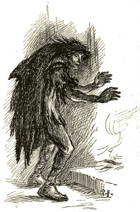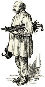 Just then John Paqualin, the charcoal-burner, came up to the open door, with a couple of empty sacks across his shoulders. Now the charcoal-burner was a great friend of little Peter's, though he was a queer figure to look at. For his red hair hung in wild locks down over his shoulders, and his eyes glowed red too—as red as his own smouldering charcoal fires—and his back was bent and crooked; while his legs were so inordinately long and thin, that all the naughty little boys in Nullepart, when he went down there to sell his sacks of charcoal, used to run after him up the street, shouting:—
