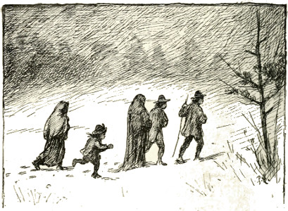 He was the youngest of the children by a number of years, and was such a small fellow that Susan Lepage, his mother, could make him quite a smart blouse and pair of trousers out of Antony's cast-off garments, even when all the patches and thin places had been cut out. He had a black, curly head, and very round eyes—for many things surprised[Pg 8] him, and surprise makes the eyes grow round as everybody knows—and a dear, little, red mouth, that was sweet to kiss, and nice, fat cheeks, which began to look rather cold and blue, by the way, as he stood on the threshold one evening about Christmas time, with Cincinnatus, the old, tabby tom-cat, under his arm. He was waiting for his brother Antony to come home from the neighbouring market-town of Nullepart. It was growing dusk, yet the sky was very clear. The sound of the wind in the pine branches and of the chattering stream was strange in the frosty evening air; so that little Peter felt rather creepy, as the saying is, and held on very tight to Cincinnatus for fear of—he didn't quite know what.