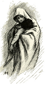 Now Eliza was sitting with her back against one of the rocks in the burrow, where the snow was lightest, and little Peter, closely wrapped in his mother's shawl, lay stupefied with sleep, with his head in her lap. As Paqualin turned round, she moaned out:—