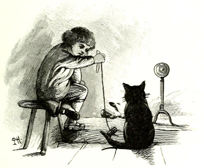 Peter retired to his stool again, in a hurry; and after thinking for a minute pulled a long bit of string, with a cross-bar of stick at the end of it, out of the bulging side pocket of his short trousers, and drew it backwards and forwards, and bobbed it up and down just in front of Cincinnatus' nose. But Cincinnatus would not play.