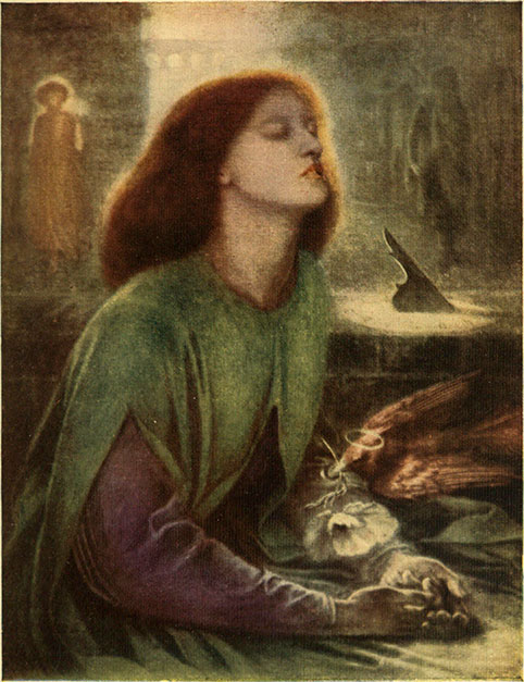 The celebrated picture of “Beata Beatrix,” now in the Tate Gallery is dated 1863, but was finished later, being only partly painted in that year. In Rossetti’s own words the following is a description of the picture: “The picture illustrates the Vita Nuova, embodying symbolically the death of Beatrice as treated in that work. The picture is not intended at all to represent death, but to render it under the semblance of a trance in which Beatrice, seated at a balcony overlooking the city, is suddenly rapt from earth to heaven....”