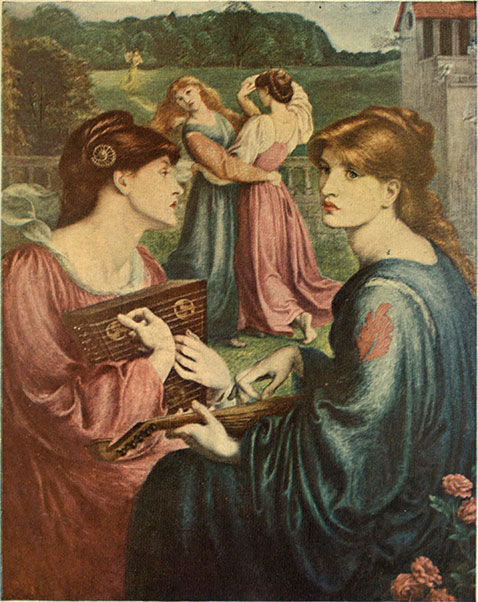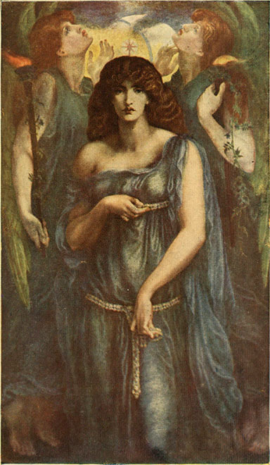 After these came “The Beloved,” finished in 1866, but worked again in 1873, this time without being spoiled. In writing to the owner of this picture Rossetti said: “I mean it to be like jewels,” and he carried out his intention. In the middle of the picture is the fair-haired bride radiant in rich stuffs, her gown is green, with large sleeves embroidered in gold and red. She is surrounded by four dark-haired maidens, on the foreground a little negro, adorned with a head-band and a necklace showing the beautiful invention of Rossetti’s taste in decorative art, is holding a golden vase of roses.
