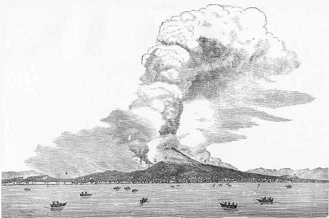 [D] Assuming these flashes to have emanated from somewhere within the cloudy volume of steam and dust called "the head of the pine-tree," this interval would indicate that the mean height of this cloudy volume itself was not more than about four thousand feet above the top of the cone; and, if so, that is not very far from the limit in height of projection of the dust and lapilli.—Translator.