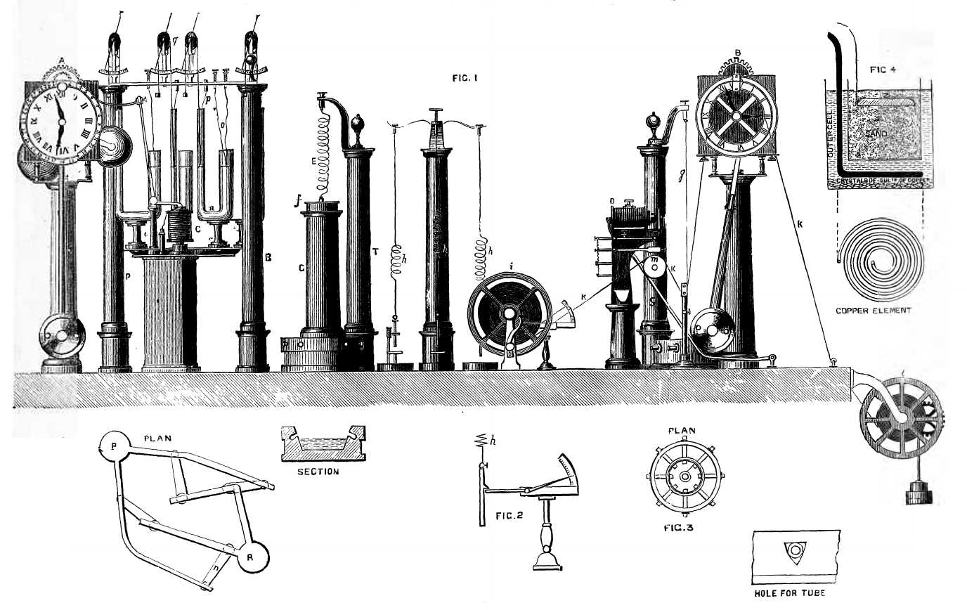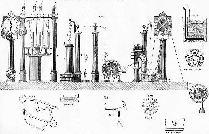 The following are the arrangements proposed for recording the horizontal motions: On the stand, to the right of the clock, A, are set four U-shaped glass tubes, open at their ends. One of each pair of vertical branches must have a diameter at least double that of the other. These pairs, with their supporting columns, are shown in plan, where one pair lies N. and S., another E. and W., a third N.E. and S.W., and the other N.W. and S.E. It will be observed that metallic bars pass from the pillar, P, over the ends of all the long branches, and similar bars pass from R, over the ends of the short branches; the pillars themselves, as in the case of the other instruments, are each connected with one pole of a Daniell's battery, the connections including the electro-magnets, C and D. The description of one U tube, n, will apply to all the others; n is partly filled with mercury, and an iron or platinum wire, o, suspended from the bar above the short branch, dips into the mercury therein, while another platinum wire hung from the bar over the mouth of the longer branch, has its end very close to the surface of the mercury in that branch. Any shock which is not perpendicular in direction to the plane of the branches of the U will cause the mercury to oscillate in the tubes, and more sensibly in that with the smaller diameter; when it rises up in [Pg 143]the latter, so as to touch the platinum point, the connection between P and R is made and the circuit completed, starting the action of the electro-magnets C and D, which record the shock, as already described. By having the planes of the tubes set in the different azimuths, already mentioned, one or more of the pairs is sure to be acted upon, and by observing in which the oscillation takes place the direction of the shock is supposed to be ascertained. Besides this, each long branch of the U, viz., that of smaller diameter, has a small ivory pulley, q, fixed above it, over which passes a single fibre of silk, with an iron float at one end, resting on the surface of the mercury; at the other end of the fibre hangs a counterpoise; fixed to the pulley is a fine index hand, capable of moving along a graduated arc. When the shock takes place the mercury, rising in the long branch, raises the float on its surface, the silk fibre at the same time makes the pulley revolve with its index hand, which afterwards remains stationary, as the counterpoise prevents the float from sinking again with the mercury. The reading on the graduated arc is thus a measure of the movements produced in the instrument by the horizontal element of the shock, and is supposed to measure that shock. It is assumed that in all these instruments shocks, however small, can be recorded with certainty by adjusting the distance between the platinum points and the mercury.