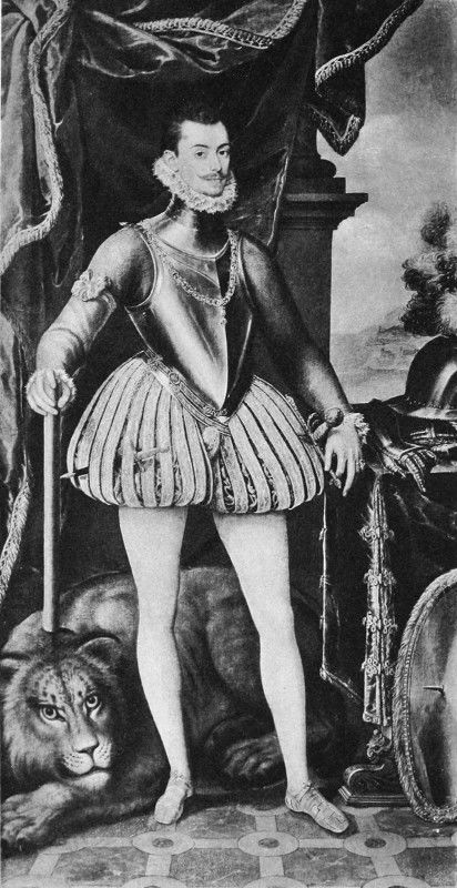 Sir William Stirling Maxwell describes this picture as "perhaps the most satisfactory existing portrait on canvas as he appeared in his prime. It is not impossible that it may be the work of Stradamus." "He wears a small rapier, the Order of the Fleece and a steel cuirass, slightly enriched with gold, with sleeves of chain armour, a band of red velvet being on the right arm and a pair of trunk breeches of some dark parti-coloured stuff, over which is a casing of crimson perpendicular bars (resembling velvet). That this outer covering or cage is detached from the lining is made evident by his dagger hanging between the lining and the cage. His hose and shoes are of light crimson, approaching to pink ... a helmet with a blue plume."