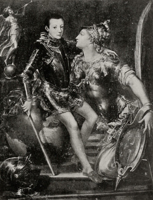 This portrait by Titian represents the Emperor at the battle of Muhlberg (1546), where, an historian says, "he looked a warrior; he rode an Andalusian horse covered with a crimson silk cloth with a gold fringe. His armour was brilliant, the helmet and cuirass garnished with gold. He wore the red sash with golden stripes of the general of the house of Burgundy."