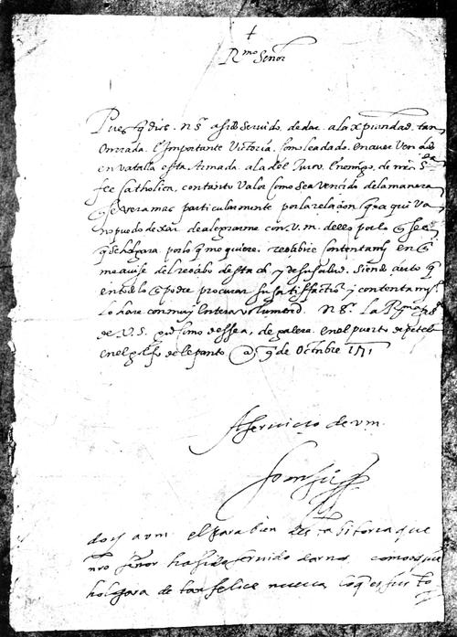 Dispatch announcing the Victory of Lepanto, dated Petala, October 9, 1571. Postscript in Don John's Writing