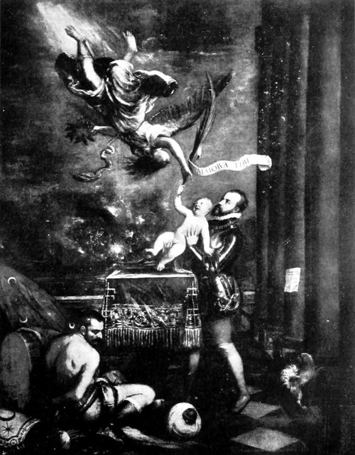 Sir William Stirling Maxwell says that tradition has connected this picture with Lepanto. Philip II is represented holding up to Heaven his short-lived son, by Anne of Austria, Don Fernando, who was born December 4, 1571, shortly after the news of the victory reached Spain. It is stated that the picture was painted by Titian (1477-1576) "at the age of ninety-four at least."