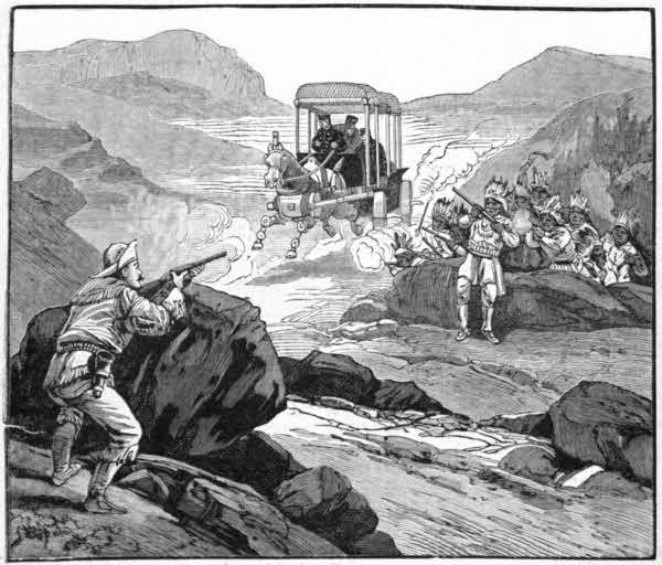 One of the bowlders near he selected and crept behind it. Then he opened fire. But at this moment from the woods in Walker’s rear now burst the other band of savages. His case seemed hopeless, indeed, when suddenly the echoes of the wilderness were awakened with the notes of a steam whistle, the rumble of wheels and clatter of iron hoofs was heard, and into view dashed the Steam Horse. But if he was shocked the Indians were doubly so.