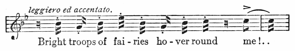 And so it is in singing. If an occasional gesture comes naturally to you there is no need to repress it, even if you cannot be recommended to go as far in this respect in the concert room as Jenny Lind did on one occasion if report may be trusted. It is recorded that once when singing Agathe’s prayer from “Der Freischütz” at a concert at Norwich she was so carried away that she actually fell on her knees on the platform and so finished the air! That was, perhaps, overdoing things. Certainly I have never heard of even an Italian concert-singer going quite so far.