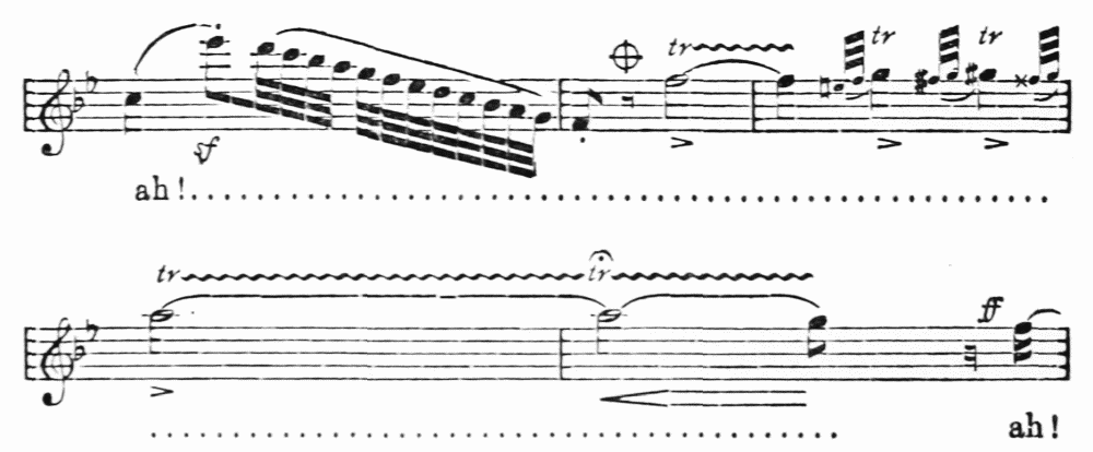 Rossini, Donizetti, Bellini, and the rest of the old masters have indeed been avenged in a wholly unanticipated manner. Precisely as the music of their school has fallen in favour has the power been lost of singing that of the so-called higher kind which has taken its place.{18}