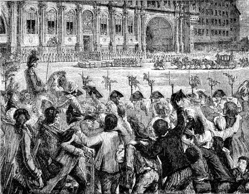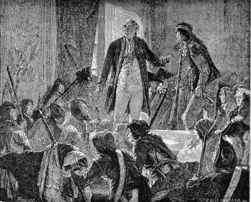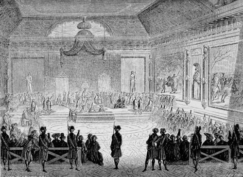 “While the principles of the American Devolution were fermenting in France, La Fayette, the hero and 467favorite of the hour, was an honored guest at royal tables and royal camps. The proud Spaniard and the Great Frederick of Germany alike welcomed him, and everywhere he announced his faith in government founded on the American idea. The financial crisis in the affairs of King Louis on the one hand, and the rising tide of the popular passion on the other, compelled the summons of the Assembly of Notables at Versailles. All the great officers of state, the aristocracy, the titled clergy, the royal princes, were there, but no representative of the people. La Fayette spoke for them, and, fearless of the efforts of the brother of the king to put him down, he demanded religious toleration, equal taxes, just and equal administration of the laws, and the reduction of royal expenditures to fixed and reasonable limits. This overturned the whole feudal fabric which had been in course of construction for a thousand years. To make effectual and permanent this tremendous stride toward the American experiment, he paralyzed the court and cabinet by the call for a national assembly—an assembly of the people. Through that assembly he carried a declaration of rights, founded upon the natural liberties of man, a concession of popular privilege never before secured in the modern history of Europe; and, going as far as he believed the times would admit toward his idea of an American republic, he builded upon the ruins of absolutism a constitutional monarchy.