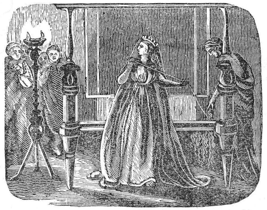 “The habiliments, in which she was hereafter to be clothed, were sanctified by the aspersion of holy water: then followed several prayers to God, that ‘As he had blessed the garments of Aaron, with ointment which flowed from his head to his beard, so he would now bless the garment of his servant, with the copious dew of his benediction.’ When the garment was thus blessed, the girl retired with it; and having laid aside the dress in which she had appeared, she returned, arrayed in her new attire, except her veil. A gold ring was next provided, and consecrated with a[Pg 252] prayer, that she who wore it ‘might be fortified with celestial virtue, to preserve a pure faith, and incorrupt fidelity to her spouse, Jesus Christ.’ He last took the veil, and her female attendants having uncovered her head, he threw it over her, so that it fell on her shoulders and bosom, and said, ‘Receive this sacred veil, under the shadow of which you may learn to despise the world, and submit yourself truly, and with all humility of heart, to your Spouse;’ to which she sung a response, in a very sweet, soft, and touching voice: ‘He has placed this veil before my face, that I should see no lover but himself.’
