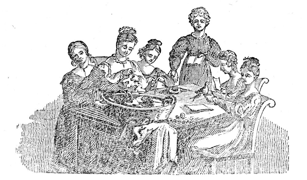 The class who are exempted from personal exertion, or at least from personal superintendence of their domestic avocations, is comparatively very small. Labor in the open fields and streets is rarely performed by women, unless it be by foreign peasantry lately arrived in the country. The buxom daughters of the Dutch farmers do indeed continue the old custom of raking hay, and the girls in Weathersfield, Connecticut, may often be seen at early[Pg 266] dawn weeding the immense beds of onions, for which that town is celebrated. A large proportion of schools throughout the country are kept by women, and it is not uncommon for them to keep shops for the sale of English and French goods, toys, confectionary, &c. Mantua-making and millinary are, of course, their peculiar province; and many are employed to tend looms in factories, to set types in printing-offices, and fold sheets for the bookbinders. By far the largest proportion of these do not work for support, but to gain additional luxuries, which their parents cannot afford to furnish. Nothing surprises a foreigner more than the near approach to equality in the dress of different classes. The rich and fashionable are in most respects like those of Europe; and humble imitators have need of great diligence to copy their frequent changes. In the article of jewels, the most wealthy cannot indeed cope with their European models; for the diamonds of a foreign duchess often surpass in value the whole fortune, real and personal, of a rich American.