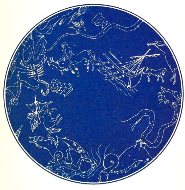 Close behind Scorpio is Sagittarius, the Archer, also a brilliant constellation, with his bow strung ready to shoot the Scorpion; he is a centaur, like the figure near the Southern Cross. He is followed by Capricornus, a very strange animal, for it has the head and horns of a goat and the tail of a fish. As a modern writer quaintly says: