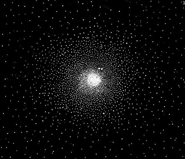 “This most glorious object,” as Herschel calls it, “the noble globular cluster ω Centauri, beyond all comparison the richest and largest object of the kind in the heavens,” is evidently quite distinct from κ Crucis and clusters like those described in the last chapter. In form it is circular, and the condensation towards the centre suggests that it is spherical. There are some scattered members of the group lying outside the bright crowded sphere. The stars are also immensely more numerous and more closely packed than in the irregular clusters, their total number being estimated at 10,000, and 6000 have been actually counted on photographs, and all these in a space which looks little larger than that occupied by the sun in the sky. Another striking difference is that, instead of bright and faint stars mingled together, here they are all nearly alike and very minute. Curiously enough, it is found that they belong to two magnitudes, and two only, the thirteenth and fifteenth, and this seems to be a feature of all globular clusters, [Pg 68] as well as the form and the dense crowding of the stars. Herschel at first thought the stars in ω Centauri “singularly equal, and distributed with the most exact equality, the condensation being that of a sphere equally filled.” But he immediately adds: “Looking attentively, I retract what is said about the equal scattering and equal sizes of the stars. There are two sizes ... without greater or less, and the larger stars form rings like lace-work on it.” In his later notes he is again doubtful, for he thinks that the effect may be optical, and the larger stars only knots of faint stars; but photography has settled the question in our day.