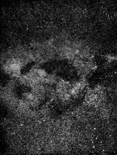 The curious dark oval rift in the midst of the bright part, which he compared with a keyhole, he found to be not entirely devoid of light, a thin nebulous veil covering part of it; and many of the dark lanes and holes which in small instruments look perfectly black, are actually filled with faint stars and extremely faint nebulosity. The whole region near the nebula is exceedingly rich in stars, and also in star-clusters, as we have already seen. To quote Herschel once again: