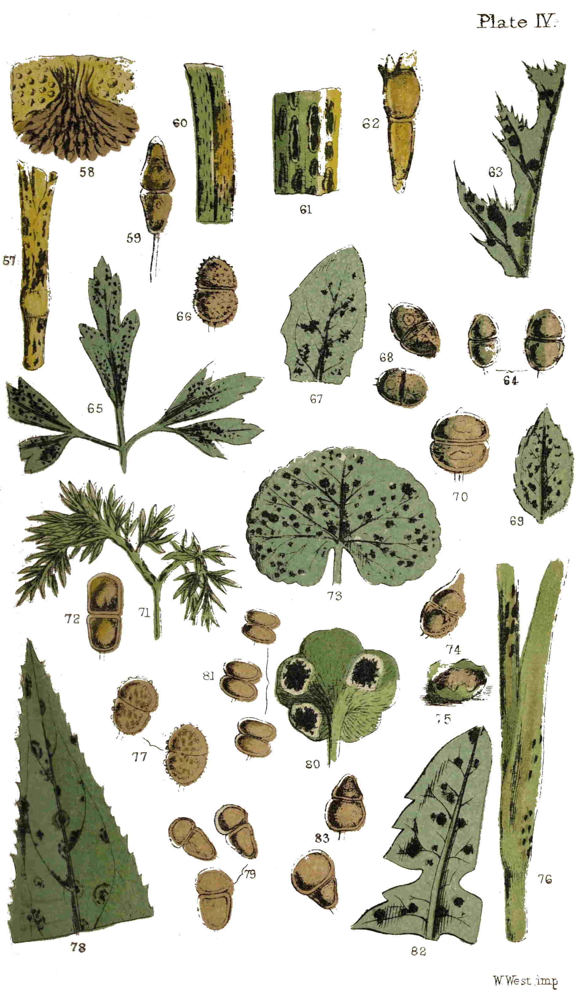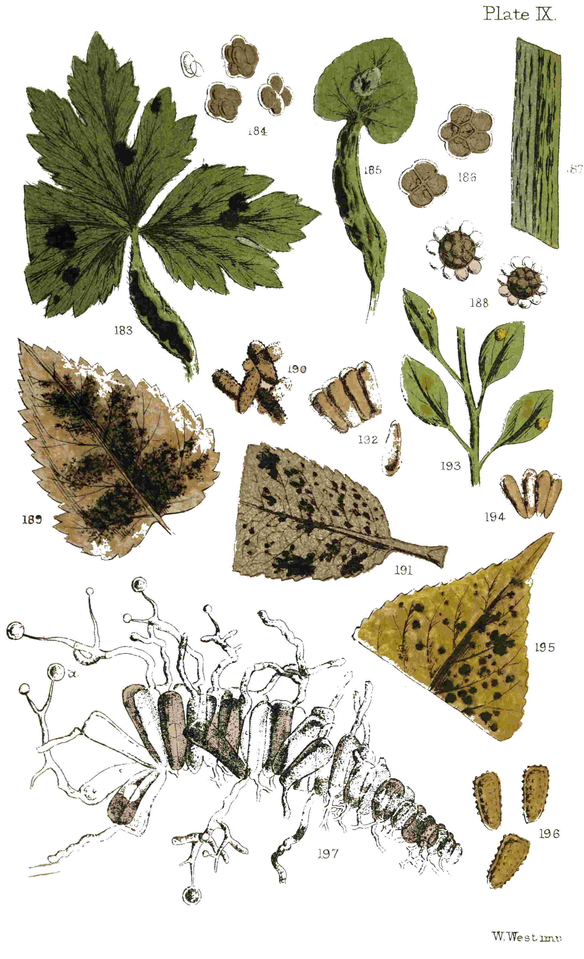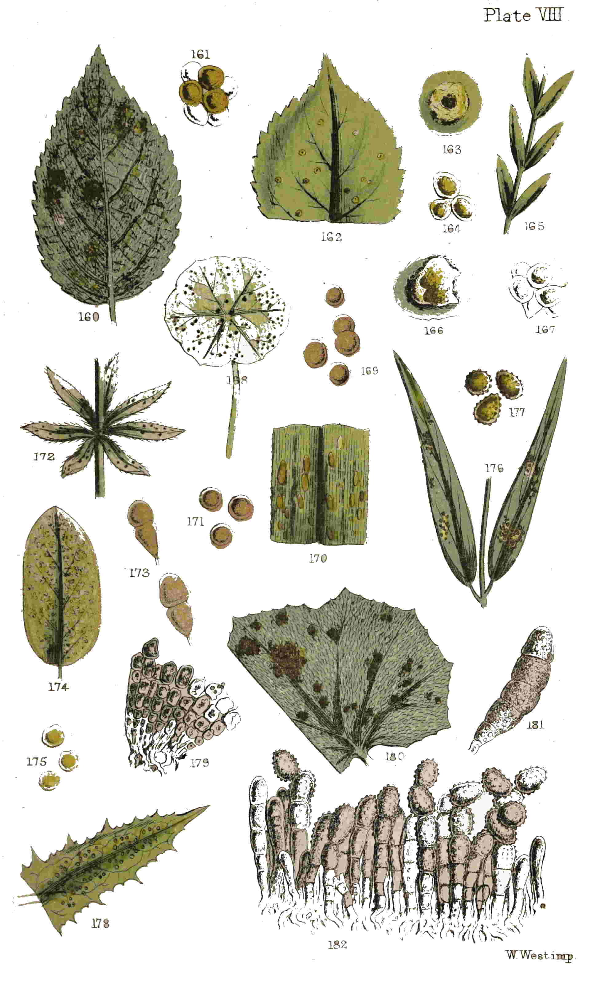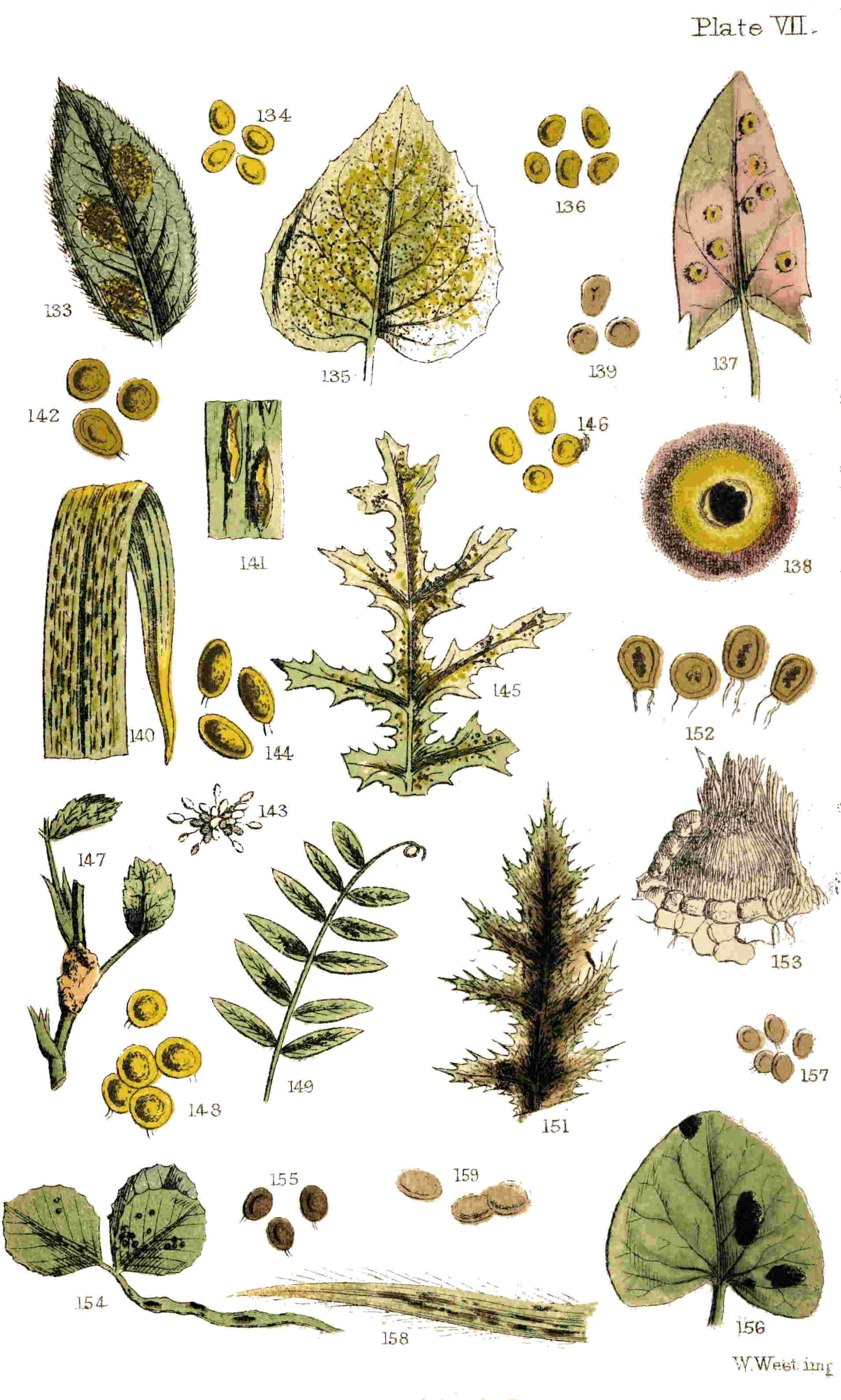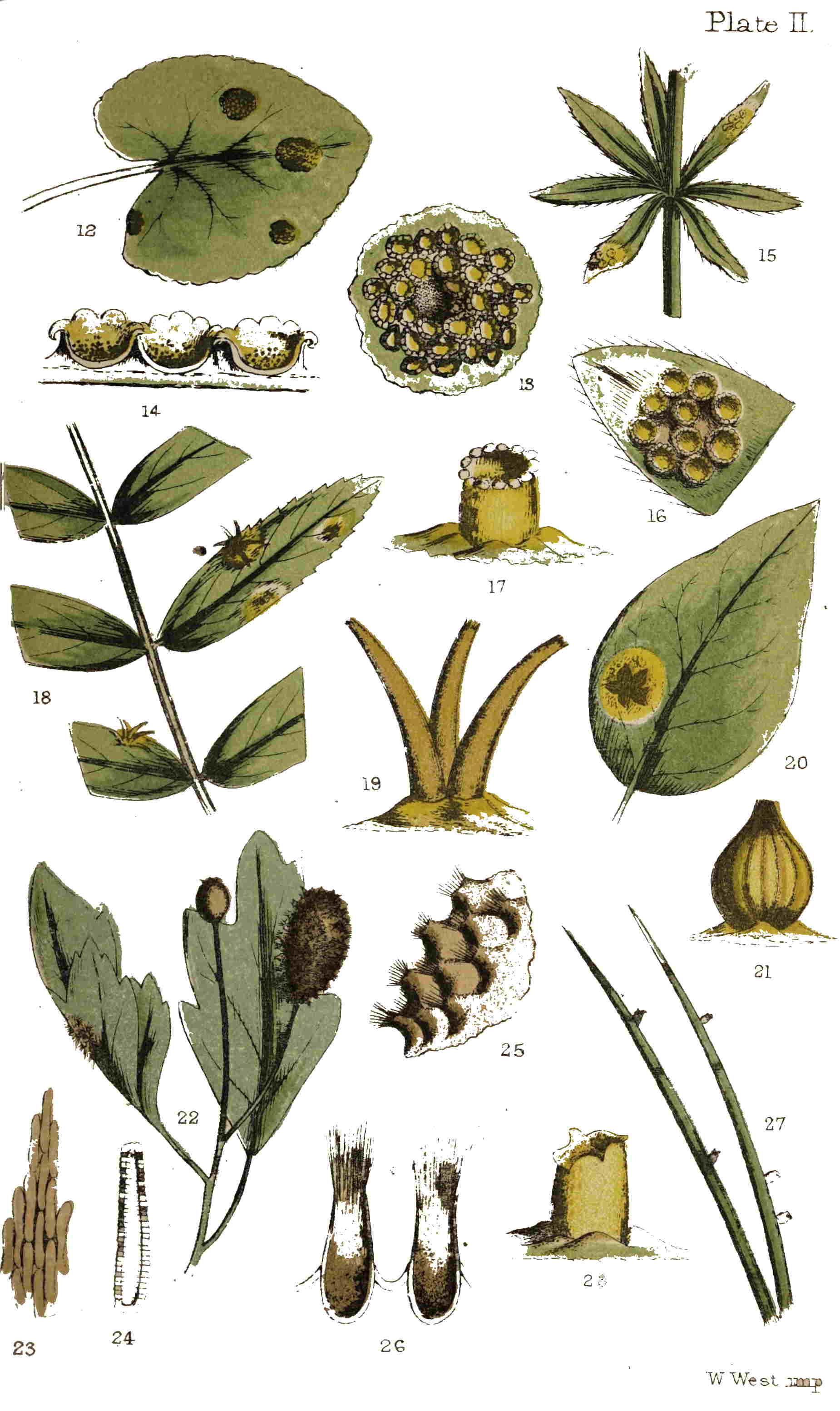 Dr. Withering observed the spore-spots on the leaves of the mountain-ash, but was evidently puzzled to account for them. He writes (in his Arrangement of British Plants), “The spots on the leaves of Sorbus aucuparia consist of minute globules intermixed with wool-like fibres. On 20examining many of them in different states, I at length found a small maggot in some of the younger spots, so that the globules are probably its excrement, and the fibres, the woody fibres of the plant unfit for its food.” We now-a-days smile at such simple and singular conjectures. It affords evidence of the manner in which the speculations of one generation become follies in the next.